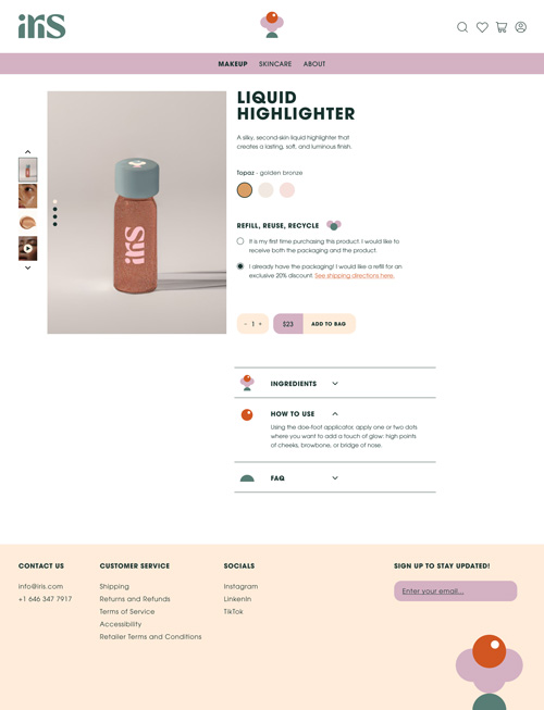 I created the brand identity for Iris, a sustainable beauty brand. The process included research, along with designing the brand's packaging, website, and guidelines.